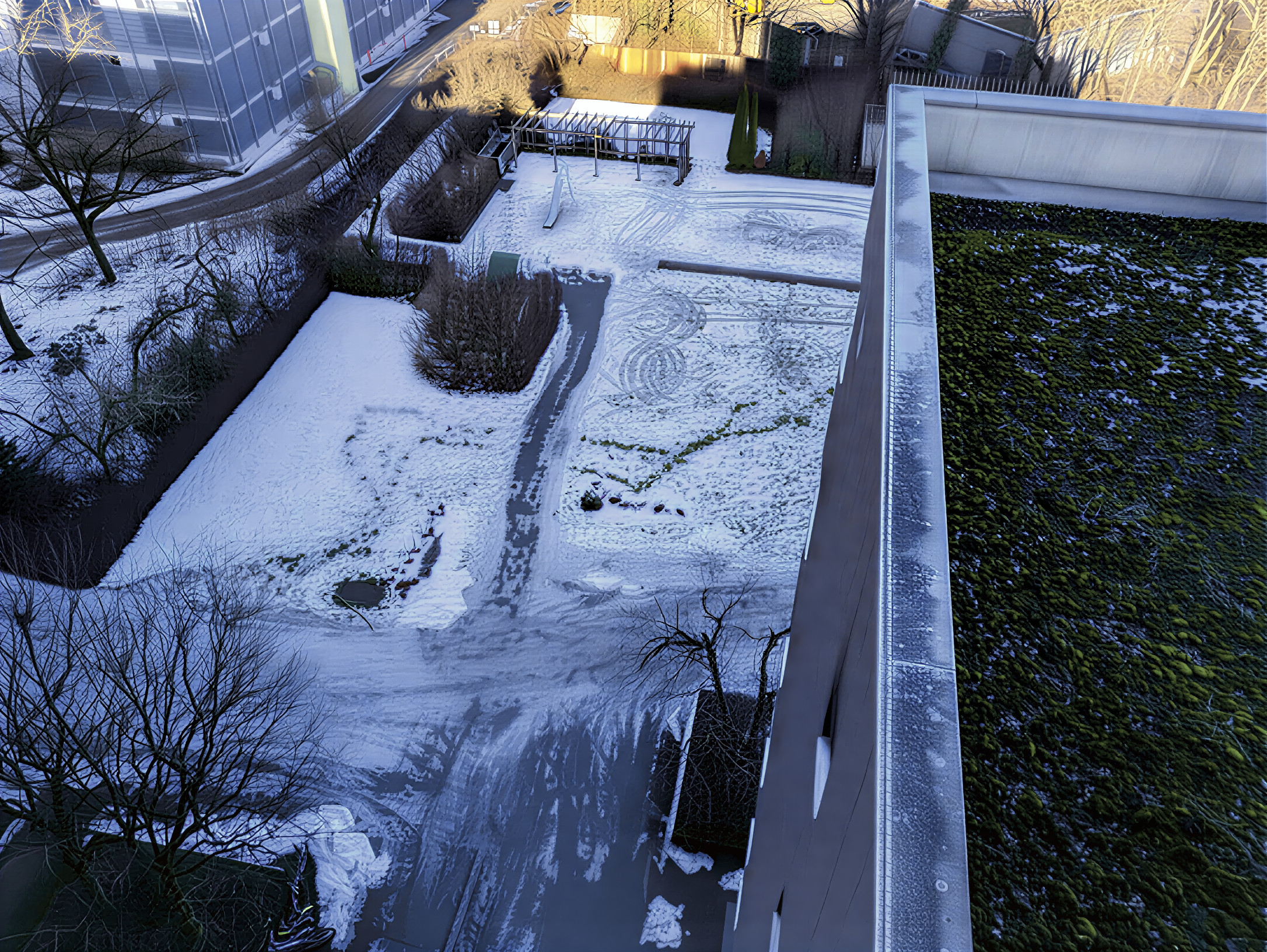 Obwohl seit ein paar Tagen deutliche Plusgrade herrschen, liegen in der im Hochhausschatten befindlichen Parkanlage der Wohnanlage Karl-Marx-Ring 52–62 (Marx-Zentrum) noch Schneereste. Foto von heute Mittag.
